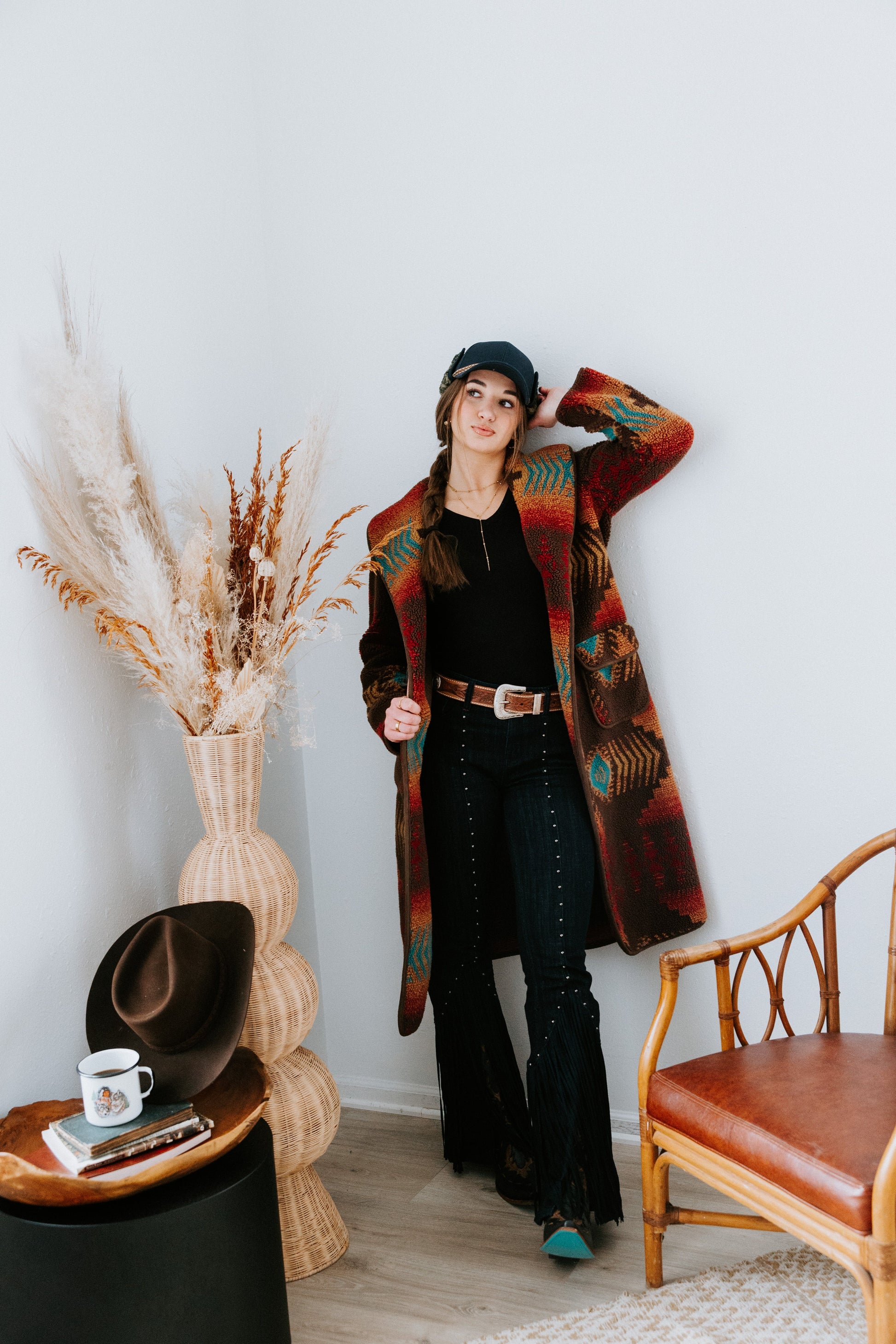 Stay warm and stylish with this one-of-a-kind winter trapper style cap. The deep navy blue panels pair perfectly with soft olive-green sherpa-lined ear flaps for cozy protection on cold days. A golden diamond-patterned band encircles the base, adding a touch of rustic elegance. The ear flaps are accented with turquoise-detailed buttons, combining practicality with a subtle pop of charm.