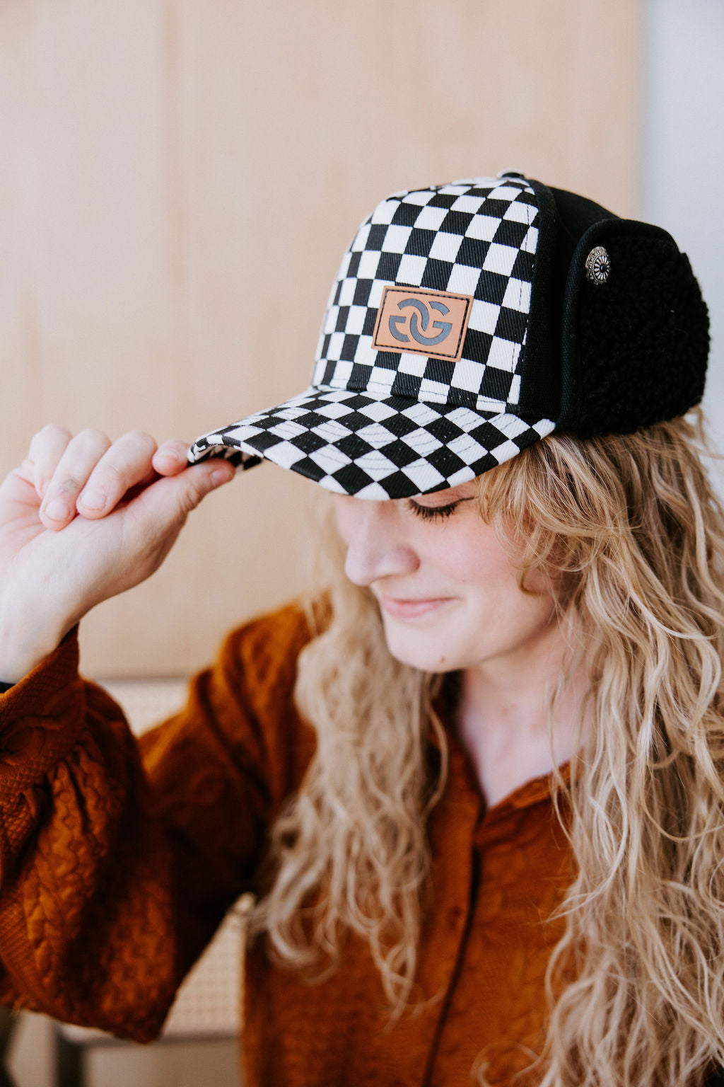 Make a bold statement while keeping cozy with this one-of-a-kind checkered trapper cap. Featuring a classic black-and-white checkerboard pattern, this fleece-lined cap brings vintage rodeo flair to winter weather. The structured crown is paired with soft black sherpa-lined ear flaps for rugged warmth, while an embossed leather patch adds a touch of western grit.